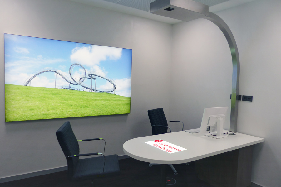 Die Sparkasse Duisburg hat sich für dieses zukunftsfähige, barrierefreie Beratersystem in dem Bereich Private Banking entschieden, um ihren Kunden eine innovative Beratung zu bieten. Ein weiterer Vorteil dieses Systems ist die absolute Multimedia Fähigkeit und die Möglichkeit der Expertenzuschaltung ohne zusätzlichen Aufwand. Dies bedeutet für den Kunden ein Gespräch auf Augenhöhe bei absolut offener Gesprächsatmosphäre, welche sich durch eine transparente und verständliche Beratung auszeichnet.